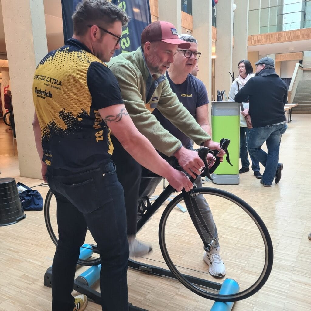 Das war doch mal eine richtig schicke BikeExpo 2026 im Kongresspalais der Stadthalle. Wir hatten dermaßen viele gute Gespräche am Stand, dass wir aus dem Reden und Erklären gar nicht mehr rauskamen. Steph hatte ihr Sprachzentrum auf Dauerschleife gestellt und in bewährt wunderbar offen-freundlicher Weise ging es assistiert von Tibor den Besuchern „an den Kragen“. Tibor griff Roman dazu unter die Arme, wenn wieder mal die freie Rolle von unseren GästInnen ausprobiert wurde. Und Ole? Der zeigte zwischenzeitlich, wie das auf der Rolle ganz locker funktioniert. Quattro-ZG-Power den gesamten Tag über.